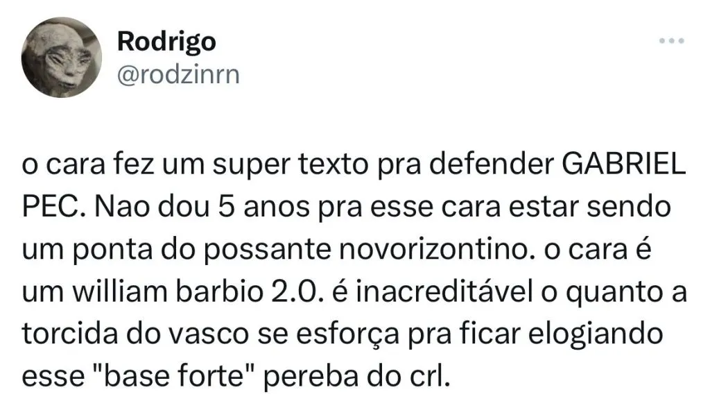 “O cara atolou a gente, espero que melhore, senão, é rua!”, disse um torcedor”. “Fui rever o jogo e cheguei a conclusão que Pec é horroroso. Perdemos por culpa dele, pode sumir daqui”, ponderou um internauta. “Não dou 5 anos pra esse cara estar sendo um ponta do possante novorizontino. O cara é um william barbio 2.0. é inacreditável o quanto a torcida do vasco se esforça pra ficar elogiando esse “base forte”, detonou.