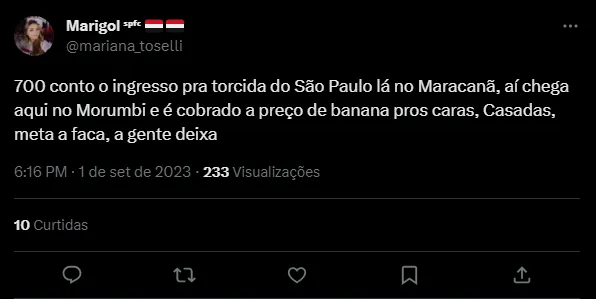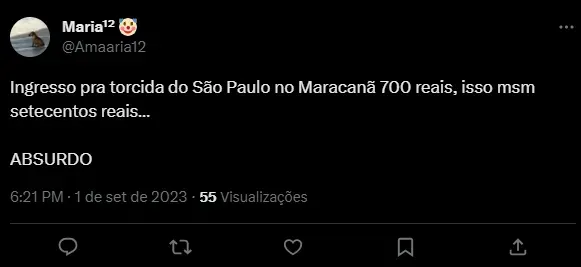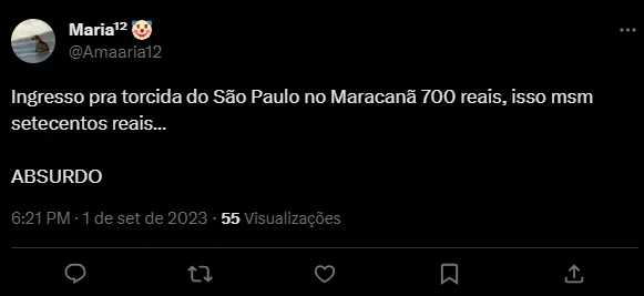 “Ingresso pra torcida do São Paulo no Maracanã 700 reais, isso msm setecentos reais… ABSURDO”;
