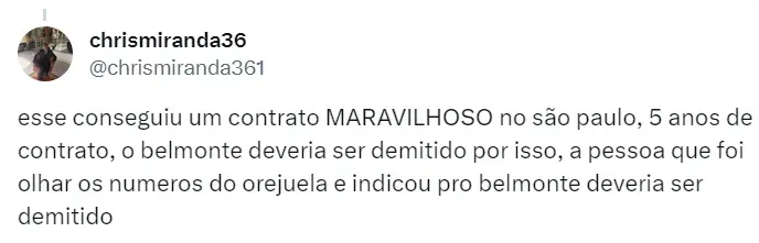 O contrato de Orejuela com o São Paulo é válido até março de 2025 e a diretoria são-paulina, até o momento, não fez nenhum movimento para que o jogador retorne ao Morumbis, onde não brilhou.