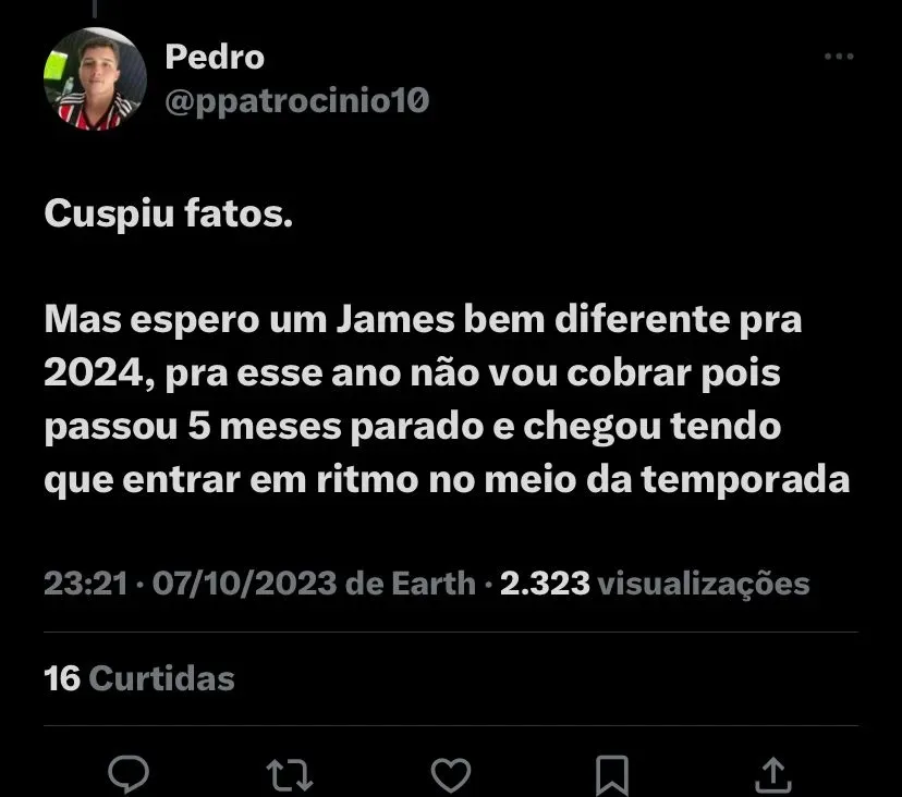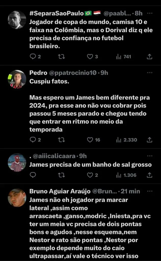 Sem Calleri que estava suspenso, Dorival optou por colorado James Rodriguez em seu lugar, apesar do status do atleta, alguns torcedores falaram do desempenho do atleta na web: (SIC) “Mas espero um James bem diferente pra 2024, pra esse ano não vou cobrar pois passou 5 meses parado e chegou tendo que entrar em ritmo no meio da temporada”; “Jogador de copa do mundo, camisa 10 e faixa na Colômbia, mas o Dorival diz que ele precisa de confiança no futebol brasileiro”, foram os comentários.