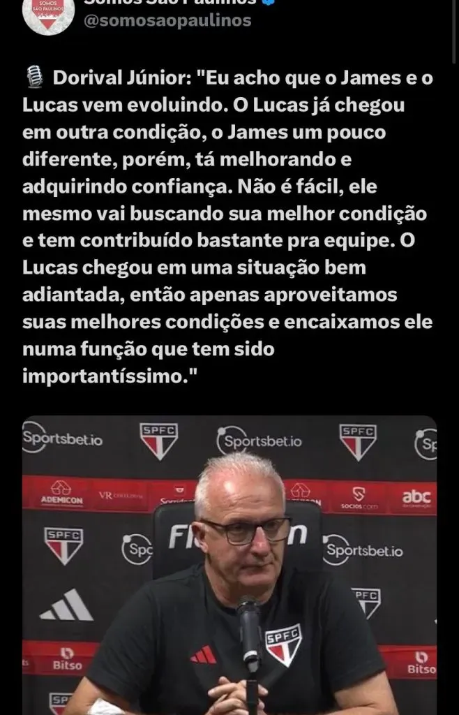 Apesar dos comentários, Dorival se postou a favor do jogador e sua evolução, além de falar da de Lucas no time: “Eu acho que o James e o Lucas estão evoluindo. O Lucas já chegou em outra condição, o James um pouco diferente, porém, tá melhorando e adquirindo confiança. Não é fácil, ele mesmo vai buscando sua melhor condição e tem contribuído bastante para equipe. O Lucas chegou em uma situação bem adiantada, então apenas aproveitamos suas melhores condições e encaixamos ele numa função que tem sido importantíssimo”, disse em entrevista coletiva após o jogo.