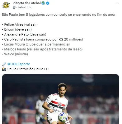 Ainda de acordo com o Uol, os três jogadores que estão fora dos planos de Dorival Júnior para 2024 são: os atacantes Alexandre Pato e Erison e o goleiro Felipe Alves. Pato e Felipe vão ficar livres no mercado. Já Erison, que pertence ao Botafogo, deve voltar ao atual líder do Brasileirão.