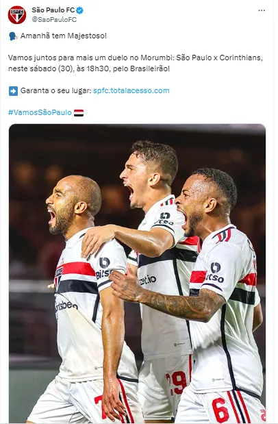 O São Paulo recebe o Corinthians neste sábado (30), às 18h30 (de Brasília), no estádio do Morumbi, em partida válida pela 25ª rodada do Campeonato Brasileiro, em mais um clássico do Majestoso. A equipe chega com ares de confronto direto, visto que ambas as equipes estão perto na tabela de classificação.