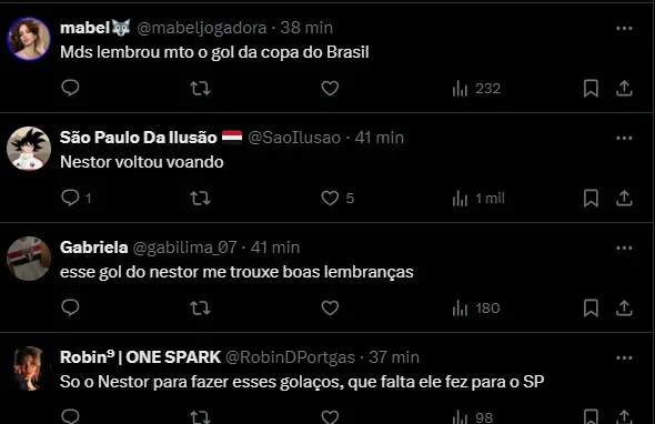 “Esse gol do Nestor me trouxe boas lembranças”, “Igualzinho o da Copa do Brasil, que emoção”, “E ele fez DE NOVO”, e “Eu lembrei, você lembrou, nós lembramos”, foram algumas reações.