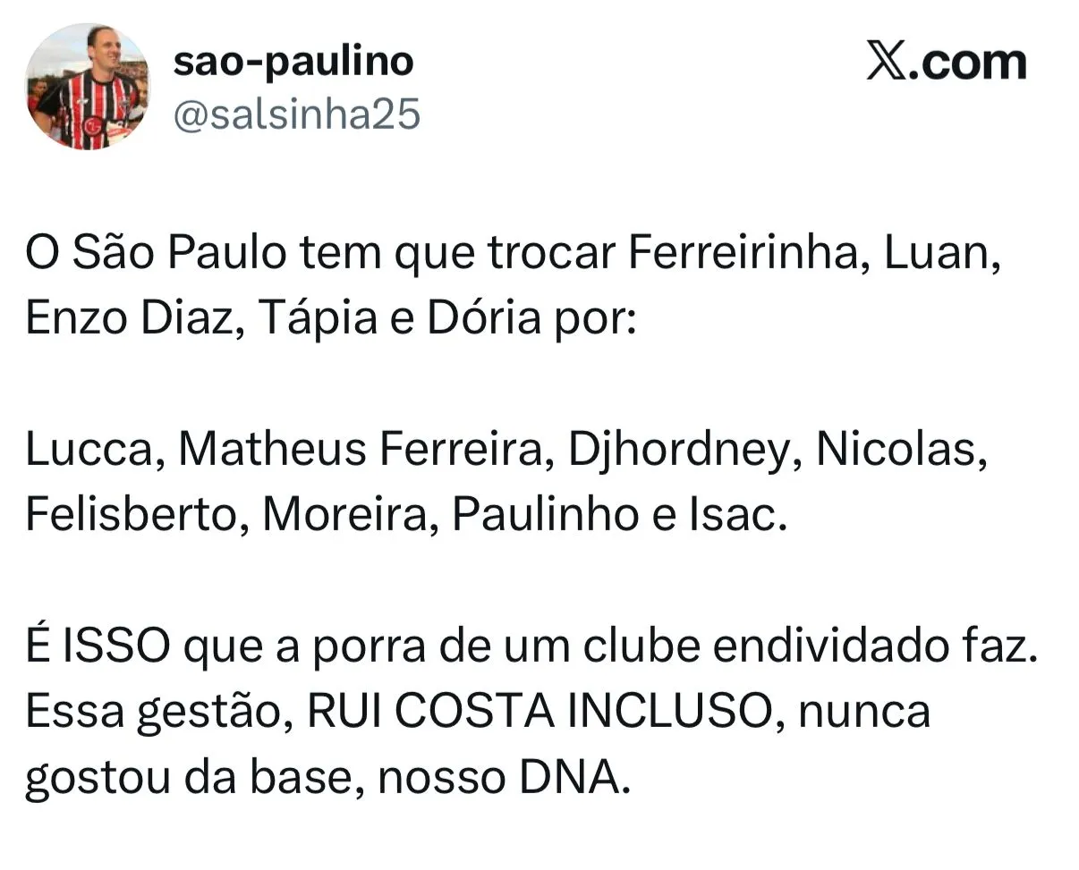 Com as lesões de Pablo Maia, Lucas Moura, Luciano e Calleri, o torcedor tem cobrado a utilização da base. Recentemente, Roger destacou a polivalência do atleta em jogar de lateral e meia no sub-20.