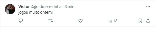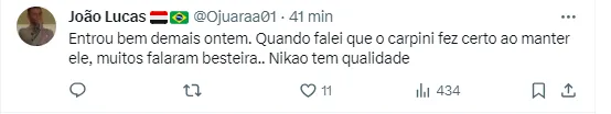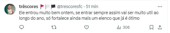 De acordo com o UOL Esporte, o camisa 43 vinha treinando muito bem. Internamente, o sentimento é que ele conseguiu trazer o que vinha apresentando nas atividades para o jogo, em sua reestreia.