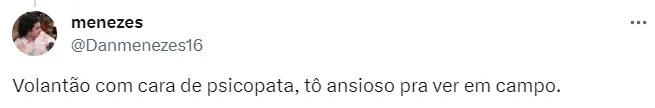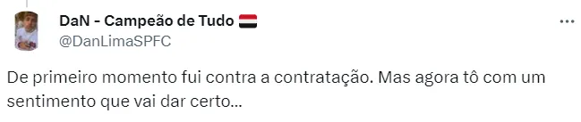 “Estou muito ansioso para ter esse primeiro contato com todos vocês (torcedores). Espero que nós, jogadores e clube, com todo o amor de vocês, possamos nos conectar da melhor forma possível”, declarou o novo volante do São Paulo.