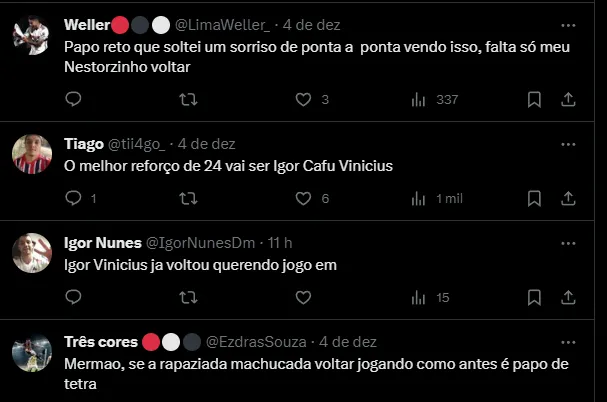 Outro que deve retorna na pré-temporada é Igor Vinícius, lateral-direito de 26 anos. Com uma grave lesão, o defensor participou de apenas dois jogos em 2023, retorna no início de 2024. Será mais uma opção na lateral-direita.