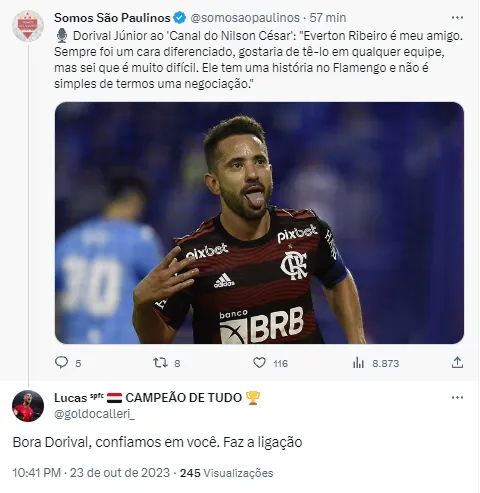 “Everton Ribeiro é meu amigo. Sempre foi um cara diferenciado, gostaria de tê-lo em qualquer equipe, mas sei que é muito difícil. Ele tem uma história no Flamengo e não é simples de termos uma negociação”, afirmou de maneira sincero o técnico do São Paulo em entrevista ao Canal do Nilson César. Dorival Júnior foi campeão da Libertadores e da Copa do Brasil no Rubro-Negro com Everton Ribeiro de capitão.