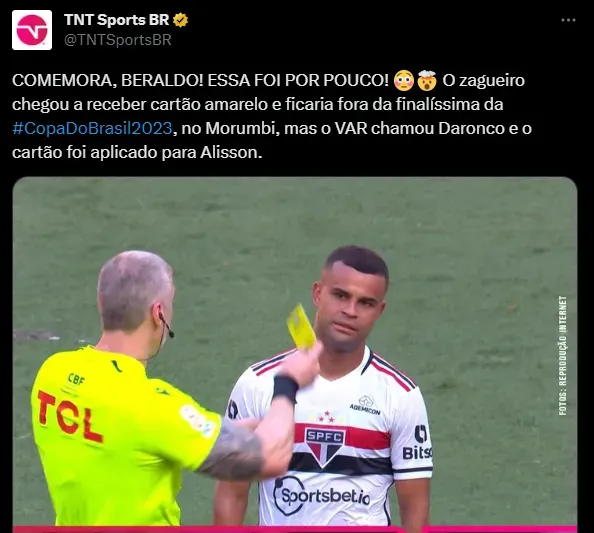 No entanto, o VAR auxiliou Daronco, que trocou o cartão, cancelou a advertência para o zagueiro e mostrou amarelo para Alisson, ‘liberando’ Beraldo para a grande decisão. Vale detacar que o São Paulo jogou com outros cinco atletas pendurados: Rafinha, Pablo Maia, Rodrigo Nestor, Luan e Wellington Rato. Nenhum levou cartão e estão liberados para a grande final.