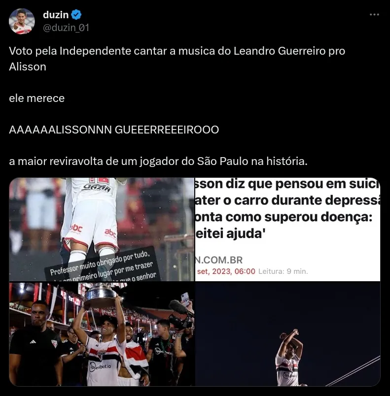 Um dos pilares do esquema tático do São Paulo, campeão da Copa do Brasil, o meio-campista Alisson comunicou publicamente o período em que teve um quadro de depressão entre o final de 2022 e o início de 2023. Em entrevista ao Globo Esporte, o jogador afirmou que, do quadro clínico somado à autocrítica em um período que sofreu repetidamente com lesões, chegou até mesmo a pedir para sair do clube.