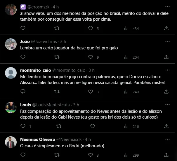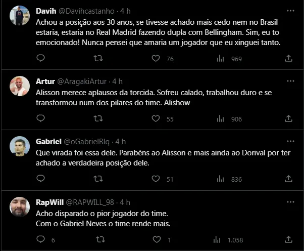 Vale frisar que, por mais que não tenha grande participação ofensiva ao longo dos 14 jogos que está atuando na nova função, sua presença no time se tornou crucial. Ele não marcou gol e contribuiu apenas com uma assistência, mas soma 90% de acerto nos passes (641/705) e 75% de acerto no lançamento (33/44), números bastante impactantes. Confira alguns comentários de torcedores do São Paulo encantados com o “novo” Alisson: