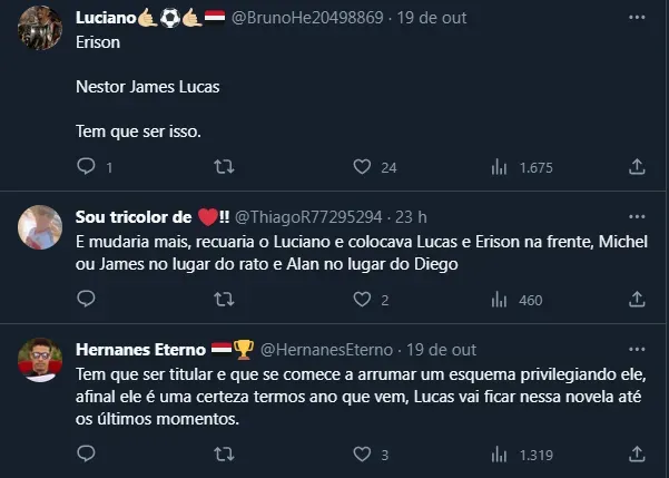 Dessa forma, de olho nos três pontos contra o time de Renato Portaluppi, alguns torcedores foram às redes sociais esboçar a formação ideal para o duelo. Em grande parte das opiniões, os nomes de James Rodríguez e Erison aparecem entre os titulares. No caso do último, vale frisar que ele é o único centroavante do elenco disponível, visto que Calleri só volta em 2024. Veja abaixo a opinião da torcida.
