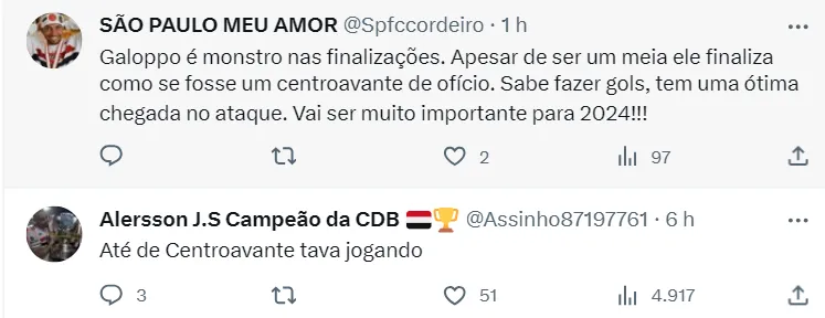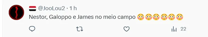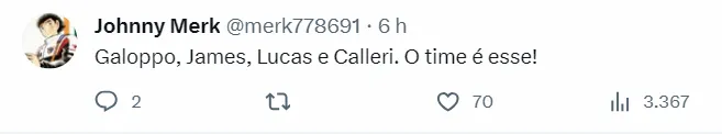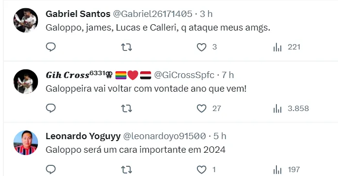 “Galoppo, James, Lucas e Calleri, que ataque meus amigos!” , “Galoppo, James, Lucas e Calleri. O time é esse!”. Outros já imaginam outro tipo de formação: “Rafael, Rafinha, Arboleda, Beraldo e Caio Paulista; Pablo Maia, Galoppo, Michel e James; Lucas e Calleri” , “Nestor Galoppo e James no meio!”, “Galoppo é para ser titular fácil com o James”, comentaram alguns torcedores no Twitter.