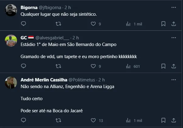 Posto isso, ainda sem local definido para a partida, o assunto virou tema na torcida do São Paulo, que tratou de opinar sobre onde a partida deveria ser disputada. Dentre os comentários, destacaram-se os pedidos para evitar o gramado sintético