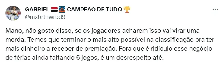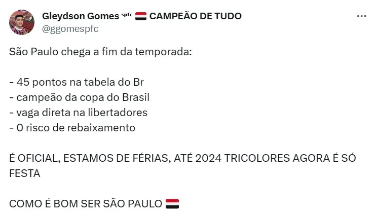 No momento, o Tricolor Paulista está na nona colocação do Brasileirão, com 45 pontos conquistados. Ainda há uma remota possibilidade de rebaixamento, mas a situação é tranquila.