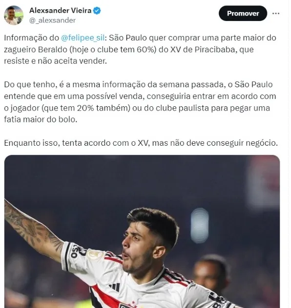 O portal ouviu que o São Paulo entende que em uma possível venda, conseguiria entrar em acordo com o jogador (que tem 20% também) ou do clube paulista para pegar uma fatia maior do bolo. Enquanto isso, tenta acordo com o XV, mas não deve conseguir negócio, visto que a equipe do interior confia em boas cifras no futuro. O Tricolor Paulista projeta R$ 110 milhões no mínimo.