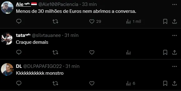 “Menos de 30 milhões de Euros nem abrimos a conversa”, “Craque demais”, “10 milhões a mais no passe” e “Nunca imaginei ler essa frase“, foram alguns dos comentários da torcida.