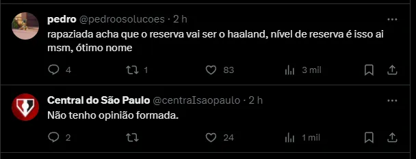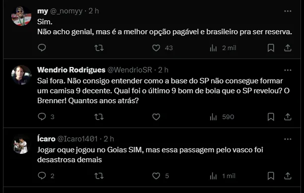 “Eu não discuto nunca nomes. Tem nomes que passam pelo nosso monitoramento, outros não. O São Paulo sempre vai buscar em posições, em que pode imaginar uma carência, ele vai trazer oportunidade, desde que caiba no nosso orçamento“, disse o atual presidente.