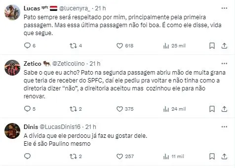 O atleta não deixou de expressar seu carinho pela torcida Tricolor: “Não entendo, poderia ser bem explicado. Foi muito boa a minha passagem, mas minha foto está lá. Tenho carinho especial pelo torcedor, vida que segue”, finalizou Pato.