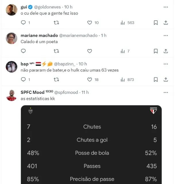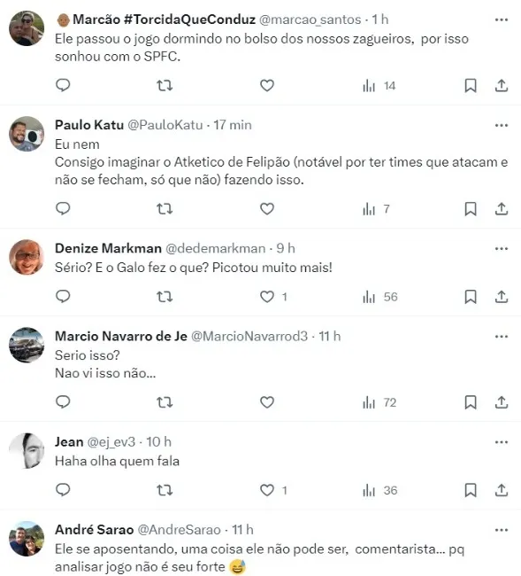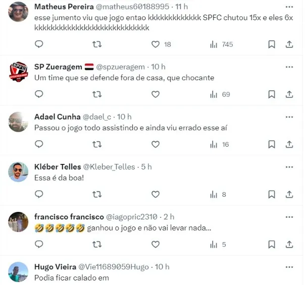 “Assisti outro jogo então porque o sp amassou esse time pequeno principalmente no segundo tempo se jogadores do sp não fossem tão incompetentes nas finalizações teríamos ganhado o jogo”.