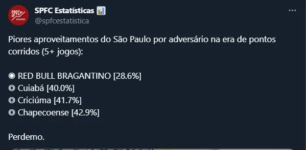 Em sete partidas disputadas até aqui, o SPFC soma um aproveitamento de 28,6% contra o Massa Bruta. Na sequência, aparecem Cuiabá (40%), Criciúma (41,7%) e Chapecoense (42,9%).