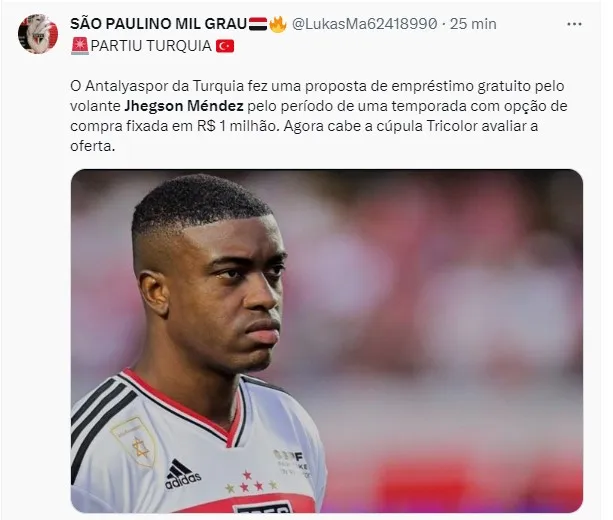 Ainda conforme as informações apuradas pelo jornalista, a proposta turca que teria chegado ao presidente Julio Casares seria de empréstimo gratuito, com uma opção de compra, sem a obrigação, no valor de 1 milhão de euros (cerca de R$ 5,3 milhões na cotação atual).