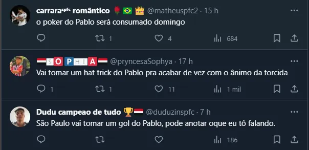 Assim, precisando somar pontos e prestes a realizar mais uma partida como visitante, o torcedor do SPFC resolveu ligar um alerta. Como o próximo adversário é o Athletico Paranaense, a partida marcará o reencontro com o atacante Pablo, que passou pelo Morumbi entre 2019 e 2021. Por mais que tenha anotado dois gols nos últimos dois jogos, ele não vive uma temporada recheada de tentos no Furacão. A peleja acontecerá domingo (29), às 16h, na Ligga Arena.