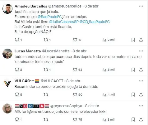 Contudo, os olhares estão voltados para a atitude que o presidente Julio Casares terá em caso de mais um tropeço. Desta forma, o jornalista Paulo Vinícius Coelho, o PVC, analisou a postura que o mandatário do Trimundial tem sobre a situação do treinador. Para o jornalista, o presidente tem focado muito nas redes sociais.
