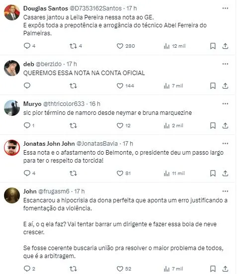 Casares não se calou e fez críticas severas ao comportamento de Abel Ferreira. O diretor Carlos Belmonte, perdeu a paciência e acabou disparando forte frase contra o treinador português. O caso se desdobrou nas redes sociais, com a presidente Leila Pereira trocando alfinetadas com o presidente do São Paulo nas redes sociais.
