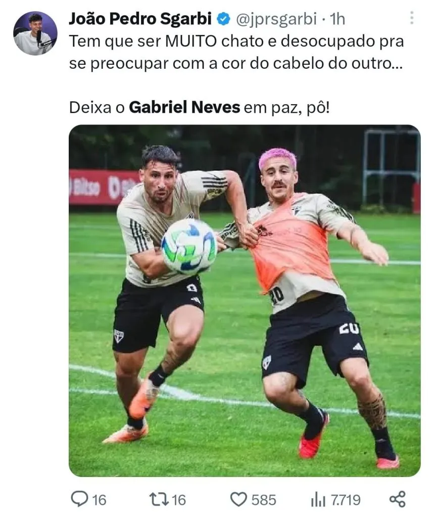 Gabriel Neves ainda lamentou a necessidade de fazer o desabafo nas redes sociais e reforçou seu compromisso com o Clube. “Não precisa ficar falando m…, nem vou jogar mais e nem vou jogar menos. Todo mundo corta e pinta o cabelo, só que eu decidi fazer da cor que queria fazer. Entendo, sim, muitos também falam que voltei da lesão jogando menos, faz parte. Eu estou treinando todos os dias com os meninos para o time melhorar e conseguir os nossos objetivos. Também não penso só no pessoal não, o time está sempre à frente. Então é isso: aproveitem o tempo de me xingar ou me criticar para fazer alguma coisa melhor. Respeito e sempre respeitei a torcida, e não deixo de fazer isso por curtir ou viver a minha vida. Enfim, estamos juntos e vamos, São Paulo. Pena ter que escrever isso, mas é a vida, né?”, concluiu.