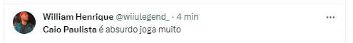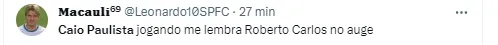 O escanteio acabou não dando em nada, mas mostrou o quanto Caio se doa ao time e fez muitos torcedores distribuírem elogios para ele: “Que achado foi o Caio Paulista, joga muito”, disse um torcedor no Twitter. Outro fez uma comparação pra lá de surpreendente a respeito do jogador do Soberano: “Caio Paulista jogando me lembra Roberto Carlos no auge”, disse. Lembrando que trata-se de um dos maiores na posição de todos os tempos.