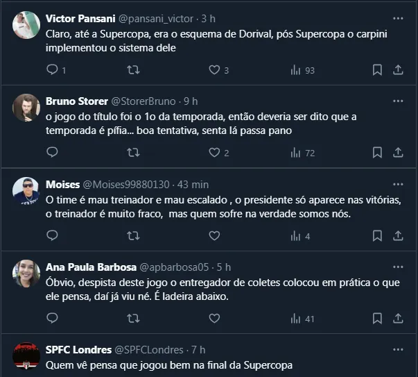 Não à toa, apesar de todas as circunstâncias, o técnico Thiago Carpini foi muito criticado após a derrota, com boa parte dos são-paulinos querendo sua demissão. Inclusive, algo que motivou ainda mais os pedidos foi a queda brusca de aproveitamento após o título da Supercopa do Brasil.