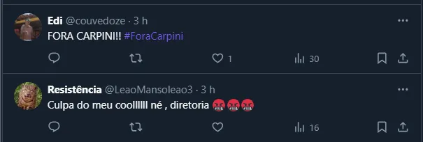 Dessa maneira, com a “descoberta” da queda brusca de aproveitamento e o medo de sofrer na fase de grupos da Libertadores, o torcedor do Tricolor voltou a pedir a demissão de Carpini neste sábado (6).