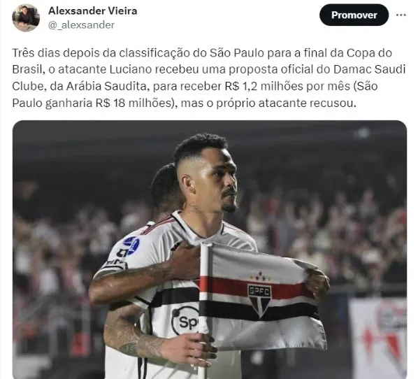 Caso conquiste o título sobre o Flamengo e a oferta volte a aparecer, ele estará mais propenso a aceitar. O clube saudita foi atrás e outro jogador do São Paulo após não conseguir a contratação de Luciano, apesar disso, também ouviu uma negativa, mas desta vez, do próprio Clube.
