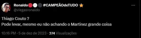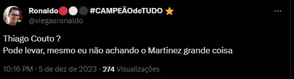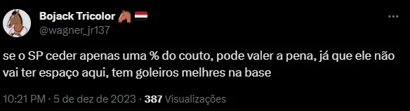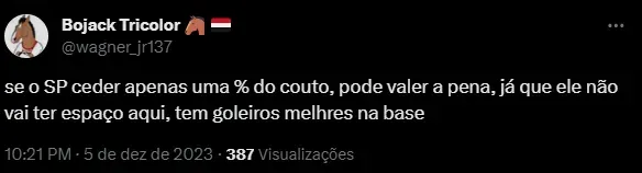 No entanto, há um porém. O América-MG quer o arqueiro revelado em Cotia de forma definitiva, abatendo do valor de cerca de R$ 12 milhões que espera ganhar com Martínez. Esse modelo não agrada a diretoria do São Paulo.