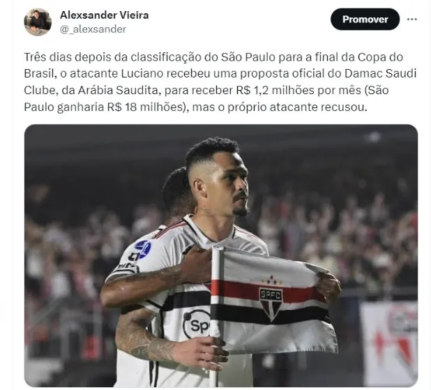 O atacante Luciano recusou proposta da Arábia Saudita. O jogador tem sido procurado por algumas equipes do exterior nos últimos meses, incluindo o México, que tentou também a sua contratação, mas ouviu uma negativa por parte do camisa 10 e também da diretoria do São Paulo.