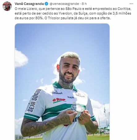 “O meia Liziero, que pertence ao São Paulo e está emprestado ao Coritiba, está perto de ser cedido ao Yverdon, da Suíça, com opção de 3,5 milhões de euros por 80%. O Tricolor paulista já deu ok para a oferta”, publicou Venê Casagrande em seu perfil no Twitter.