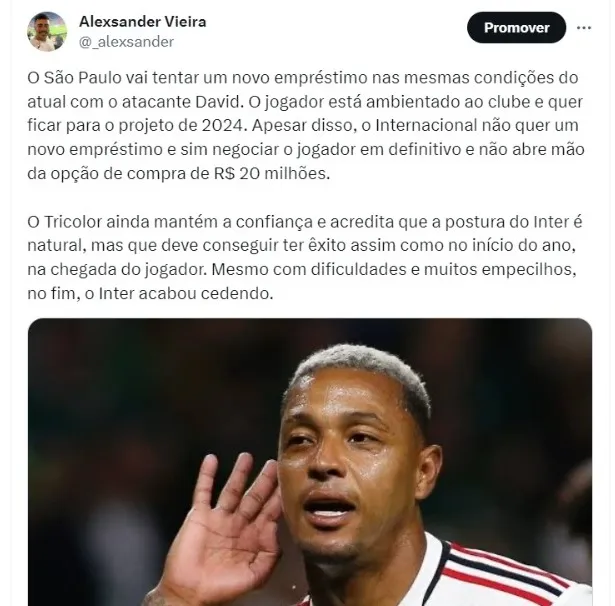 R$ 20 milhões, foi confirmado agora: Situação de David no São Paulo ganha reviravolta com exclusiva