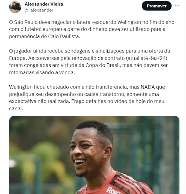 As conversas pela renovação de contrato (atual até dez/24) foram congeladas em virtude da Copa do Brasil, mas não devem ser retomadas visando a venda. Welington ficou chateado com a não transferência, mas nada que prejudique seu desempenho ou cause transtorno, somente uma expectativa não realizada.