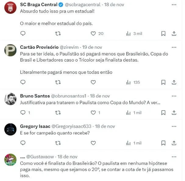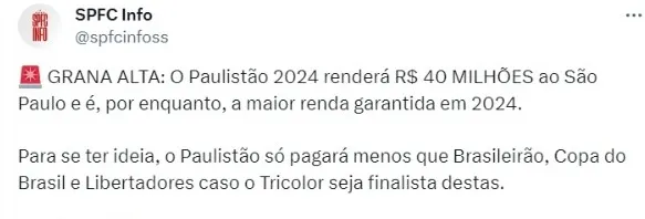 A informação foi divulgada por Danilo Lavieri, em sua coluna no UOL. As novas premiações do Paulistão colocam o campeonato no patamar financeiro de grandes competições.
