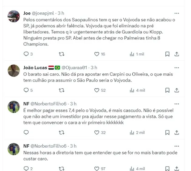 A multa dos três treinadores que o São Paulo está de olho para suceder Dorival: Vojvoda: R$ 7,4 milhões, António Oliveira: R$ 5 milhões e por fim, Thiago Carpini: R$ 1 milhões.
