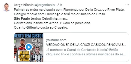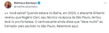 O jornalista ainda deixou claro que até o momento o centroavante não recebeu nenhum contato. “Gilberto já foi especulado nas últimas horas como reforço do Bahia e também do São Paulo antes de gravar o vídeo consultei um dirigente do Cruzeiro que assegura que nenhum clube brasileiro entrou em contato para falar sobre o atacante Gilberto”.