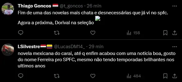 “O Ferreirinha ainda não é jogador do São Paulo na cabeça dos dirigentes por causa de um cara que foi anunciado hoje pelo Palmeiras, que é o Caio Paulista. Teve o aceite, teve a sinalização positiva, agora faltam os trâmites”, disse o jornalista na última sexta-feira.