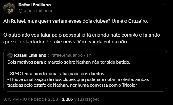 Além do Bragantino, o Cruzeiro também está de olho em Nathan, de acordo com informações do repórter Rafael Ribeiro, do Avante Meu Tricolor. Há um outro clube interessado, mas o nome não foi revelado.