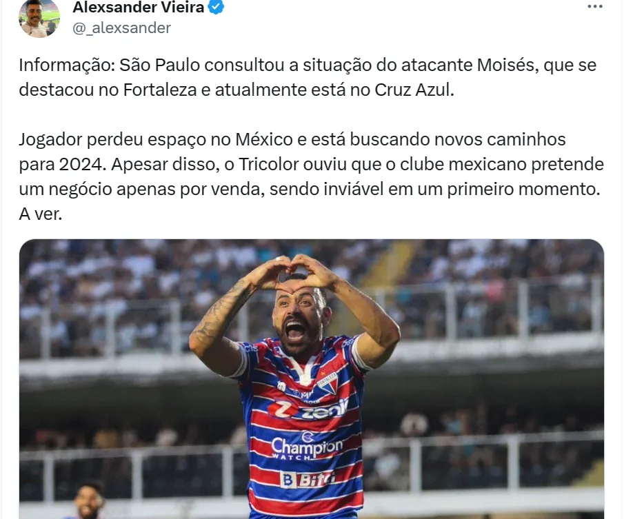 Nesta segunda-feira (20), o jornalista Alexsander Vieira, do Bolavip Brasil, apurou que o São Paulo buscou informações do atacante Moisés, ex-Fortaleza e hoje no Cruz Azul, do México.
