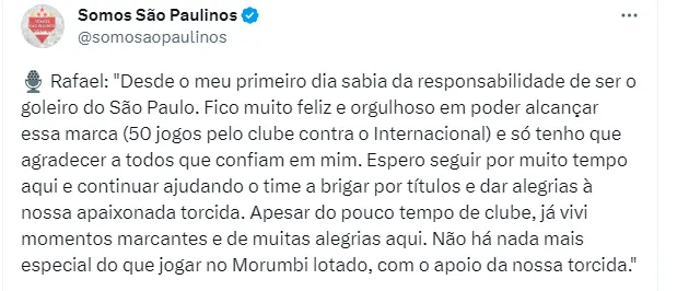 Rafael foi além e ainda falou que jogar no estádio do São Paulo é um momento único: “Apesar do pouco tempo de clube, já vivi momentos marcantes e de muitas alegrias aqui. Não há nada mais especial do que jogar no Morumbi lotado, com o apoio da nossa torcida”, complementou o camisa 23 são-paulino. O jogo contra o Internacional acontece no Beira-Rio, às 21h30 (de Brasília).