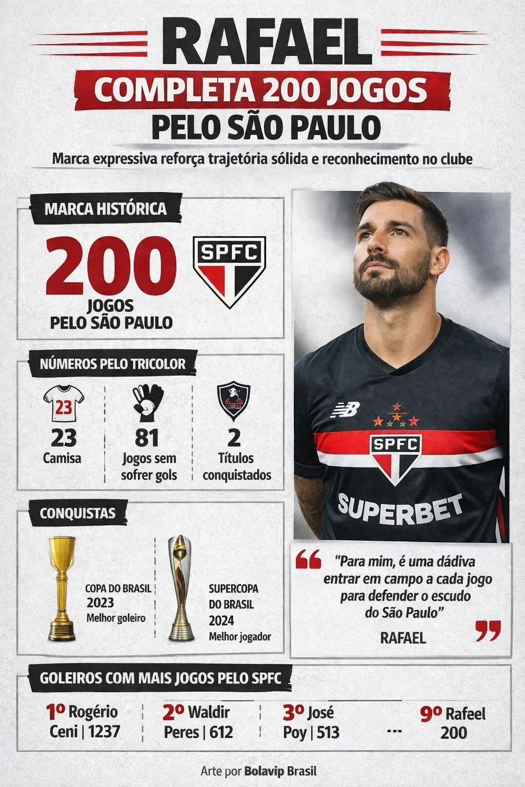 “Fico muito feliz. Sou um cara muito grato ao São Paulo e aos torcedores pela confiança que depositam em mim. Para mim, é uma dádiva entrar em campo a cada jogo para defender o escudo do São Paulo, e poder fazer isso 200 vezes é um privilégio para poucos”, comentou Rafael, que já sonha com novas marcas.
