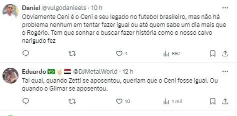 “Ninguém vai substituir o Rogério Ceni. O que ele foi para o futebol e é para o futebol, ele sempre vai ser. Cada um tem sua história no futebol. Ninguém vai vir aqui e tentar repetir o que ele fez”, afirmou o arqueiro.
