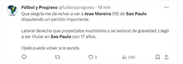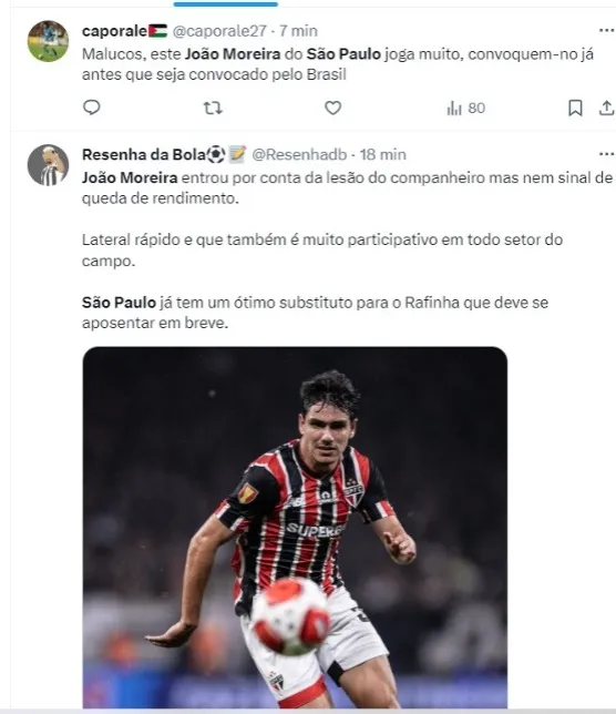 “João Moreira entrou por conta da lesão do companheiro mas nem sinal de queda de rendimento. Lateral rápido e que também é muito participativo em todo setor do campo. São Paulo já tem um ótimo substituto para o Rafinha que deve se aposentar em breve“, escreveu um torcedor no X.